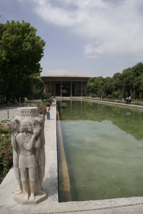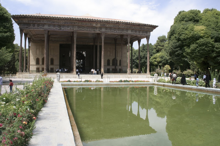 Ertesi gün – yazıldığı gibi söylersek – “Kabir” otelde kahvaltıdan sonra Kırk Sütun sarayını ziyaret ediyoruz. Şah Abbas zamanında büyükçe bir bahçenin içine yapılmış bu saray. Havuzun arkasına geçip doğru bir açıdan bakarsanız, 20 tanesi fiziki 20 tanesi de akis olmak üzere 40 sütunu da sayabilirsiniz.